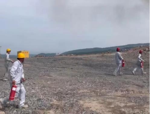 此次演練,災情設定挖掘機在進行焊接作業時,焊接火花飛濺引燃一旁維修時使用的擦拭油料的棉紗,由于維修位置靠近清表時砍伐的樹木且臨近礦區邊緣林區,由于當天風勢較大待發現時被砍伐的樹木已被引燃且火勢洶涌,發現火災事故的員工立即通知帶班領導。帶班領導接到報告后,立即啟動應急預案,組織人員進行滅火。