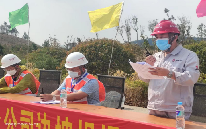 本次演練主要是模擬邊坡坍塌人員被砸傷的情景,演練開始,首先由現場工作人員按照預案進行事故上報,接著現場負責人王海生安排所有作業人員和設備撤離現場并上報應急指揮小組,副組長龔士朋在接警后向組長魯臣匯報情況后請示啟動應急救援預案,組長魯臣下達指令:“立即啟動應急救援預案!”副組長龔士朋迅速組織通信警戒組、搶險救援組、物資保障組等按照各小組的分工與職責,趕赴現場展開救援,轉移受傷人離開險境,緊急處理傷員傷勢并與現場等候的120急救人員協力送醫救治,圓滿完成各項演練任務。